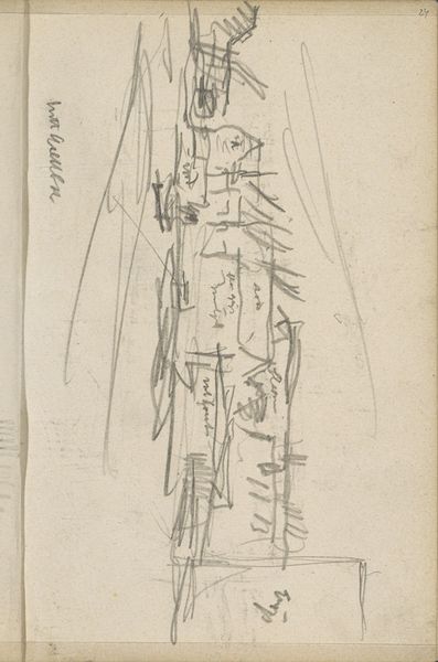 Curator: It has a ghostly quality. Like a faded memory sketched in a rush. Editor: Indeed. What we are looking at is "Landschap met wolkenlucht" or "Landscape with cloudy sky," a drawing by George Hendrik Breitner, dating from 1887 to 1889. It's currently housed here at the Rijksmuseum. It appears to be executed primarily in pencil on paper. Curator: Pencil work, you say? Notice the varied pressure. He wasn’t just outlining; he was really layering, building tone. Was this a preparatory sketch, I wonder, for a larger painting? It certainly demonstrates a great understanding of tonal possibilities offered by modest, accessible materials. Editor: Breitner’s choice of medium certainly speaks to the ready availability and affordability of such materials for an artist working during that period. This allowed for more democratic participation in artistic expression, diverging from exclusive oil paintings for wealthy patrons. Now, Breitner was known for his paintings of Amsterdam city life. Seeing him work on landscapes and the sky suggests an engagement with more traditional subjects. How does this piece speak to the dominant social and political narratives of the late 19th century in the Netherlands? Curator: Well, if we look beyond the subject, it’s still engaging with the industrial changes. Consider the mass production of pencils—facilitating sketches like these. Also, he’s not presenting a romantic idyll; instead, the almost hurried strokes, even if it doesn’t contain buildings, seems in line with documenting the pulse and feeling of rapid urbanization. It is no rural vista; it seems, quite simply, a sky undergoing constant change, a moment in time quickly grabbed. Editor: I see your point. And in that speed, Breitner is arguably capturing a feeling, rather than aiming for precise topographical representation. Perhaps he's grappling with a societal feeling of the time. He’s certainly pushing the boundaries of what constituted “acceptable” subject matter, as we can see looking at the sky, the working class areas, the modes of transportations he portrayed. And of course, institutions like our very own, played an active role shaping public perception. Curator: So even this small sketch embodies the push and pull between artistic exploration and established social norms. Editor: Exactly. I think what Breitner accomplishes here is a demonstration how socio-political context shapes artistic intention and output. It speaks volumes of his milieu, no matter how seemingly simple, the medium.