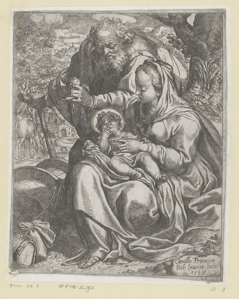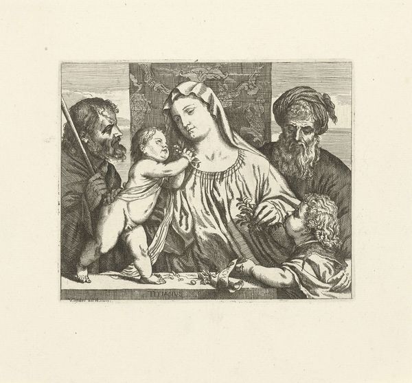 Curator: This arresting print is by John Linnell, who lived from 1792 to 1882, and is part of the Tate collection. It depicts a scene of motherhood. Editor: The stark contrast and tight composition definitely evoke a sense of emotional intensity. Is that supposed to be Mary and the children? Curator: Possibly, but it also hints at larger social narratives of maternity and caretaking within the domestic sphere. We can see the contrast between the two women. Editor: And the children’s poses feel so raw and real, full of the chaos of early childhood. It feels less idealized than many depictions of motherhood we see. Curator: I agree. The artist has chosen to show these children in motion, perhaps signifying the labor of motherhood that often goes unseen. Editor: Yes, it’s a powerful visualization of the many roles women are expected to occupy, both then and now. This really makes you think. Curator: Indeed, and perhaps it prompts us to consider the social and political contexts that define those roles. Editor: A deeply evocative print.
