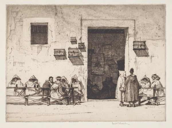 Curator: This print, "The Fountain at Peille, Cote d'Azur", attributed to Earl Stetson Crawford, presents us with a glimpse into daily life, likely from the late 19th or early 20th century. The etching technique offers a compelling window onto the scene. Editor: The mood strikes me as both serene and subtly burdened. There's a communal aspect, but the women around the fountain also seem preoccupied, perhaps weary from the routines depicted. It feels like an observation of women in a place that does not give space for them to relax. Curator: Indeed. Fountains in cityscapes often symbolized more than just access to water. They can represent community gathering points, a shared space of both necessity and social interaction. Water itself, in iconographic terms, often carries cleansing or renewing properties, both literally and figuratively. Editor: I'm interested in that shared space. Note the sharp contrast between light and shadow – a powerful compositional tool, of course, but also symbolic, isn't it? The women are caught between these extremes, illuminating their labor while perhaps underscoring the socio-economic divisions of the time. Curator: Absolutely, consider the implied narratives woven into this cityscape. The clothing, the tasks, and even the architecture point towards the continuities of traditional lifestyles. The very act of etching itself – a labor-intensive process – mirrors the diligence of these women's lives. Editor: And how that diligence so often goes unacknowledged! While the landscape evokes a picturesque charm, one must remember that those scenes exist as lived realities for so many women doing the everyday labor. Curator: Yes. We bring our own perspectives to bear when viewing historical artwork. As much as Crawford documents a moment, we analyze through the lenses of our contemporary concerns with gender, class and the nature of work itself. Editor: Exactly. Seeing the figures clustered around the fountain, I'm reminded how essential these gathering spaces were—and in some places still are—for women’s networks and support systems in many patriarchal societies. Curator: Ultimately, it prompts a dialogue. We can appreciate Crawford's artistic skill, the careful rendering of light and texture, whilst simultaneously acknowledging the unsaid histories that the artwork prompts us to examine. Editor: Right, the past speaks to us, sometimes more loudly than others, if we take a moment to really see, really question what is there and is not represented in visual cultures and what its implications were.