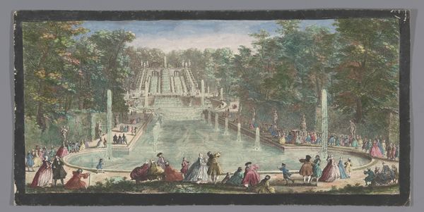 This print of the cascades of the garden of the Château de Marly was made with etching and possibly some engraving. The matrix was probably metal, and the impression has been colored by hand. The choice of printmaking is significant because it allowed for the mass distribution of images. This one shows an idealized vision of leisure, a lifestyle afforded by the labor of many others. Look closely at the details – the figures in their elaborate costumes, the meticulously designed landscape with its cascades – all created through immense manual work, and intended to reflect the power of the aristocracy. Consider the material qualities of the print. Its delicate lines and soft hues create a sense of refinement. But this belies the immense social effort required to produce both the print itself, and what it represents. Paying attention to this helps us to understand the complex relationship between art, labor, and social class.