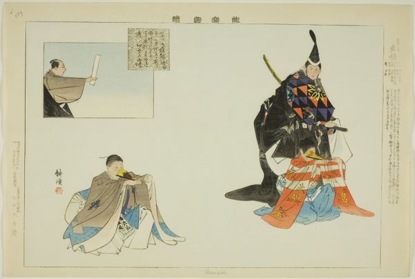 Tsukioka Kôgyo made this woodblock print called "Chisho" sometime between 1890 and 1920. The print displays an actor in a dramatic pose, central to the composition, set against a muted background. The actor's costume, primarily black with geometric gold patterns, contrasts sharply with the white skirt and the paler background, creating a striking visual hierarchy. The arrangement of elements in this print reveals much about the artist’s intent. Kôgyo uses the flatness of the print medium to emphasize the two-dimensionality of the design. The geometric patterns on the costume, combined with the stylized depiction of the figure, suggest a deep engagement with the formal properties of line, shape, and color. Note how the two insets at the top-right challenge conventional perspective and depth. These miniature scenes—one a geometric grid, the other a seascape—disrupt our expectations and invite a deeper reading of the image's structure. Kôgyo is not just representing a scene; he is actively exploring the formal possibilities of the print medium. This emphasis on form over traditional representation aligns with broader artistic movements of the time that questioned fixed meanings and explored new modes of visual expression.