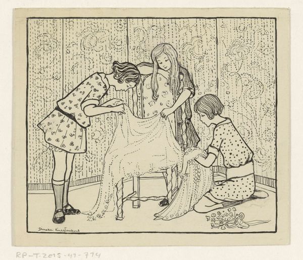 Editor: So, this is "Gazette du Bon Ton, 1920 - No. 1, Pl. 3: La lettre surprise" by Fernand Siméon, a mixed-media print on paper. The mood seems pretty melancholic, a sort of intimate sorrow, almost theatrical, don’t you think? How do you interpret this work? Curator: This image feels steeped in the complexities of early 20th-century gender roles, doesn't it? Notice the performative nature of both figures, staged almost. He, presenting himself with a slightly arrogant composure, seemingly controlling the narrative. She is captured mid-gesture, is she writing or has she just received the “surprise” of the letter? What do you make of her being turned away, and what kind of dialogue might that be fostering with contemporary theory regarding the position of women in society? Editor: It does make you wonder about power dynamics. Her face isn’t visible, her emotions almost masked by the posture and angle. And, is she writing or reading, either way it reduces her presence. Curator: Exactly. It pushes us to question whose story is being told and from whose perspective? Are we, as viewers, being invited to empathize, or are we kept at a distance, complicit in this very staged scene? The details in his attire almost amplify the message he controls, while hers diminishes it. It's important to reflect how art like this contributes to broader intersectional narratives about gender and power structures. Does it confirm, challenge, or somehow subvert expectations of its time? Editor: It is quite a somber message on gender constructs, staged almost as propaganda. Thank you! I'll look at early 20th century images quite differently now. Curator: Gladly. It reveals that there is still so much more to the image, the time and to ourselves.