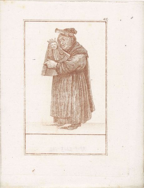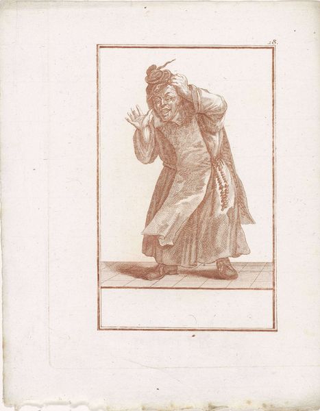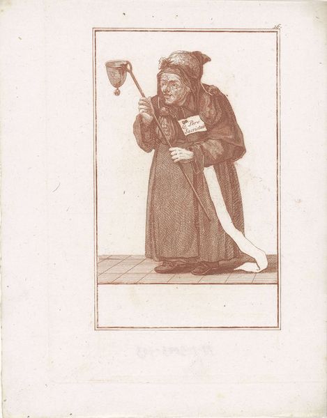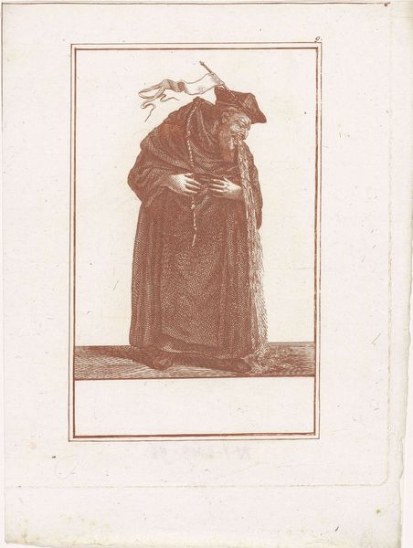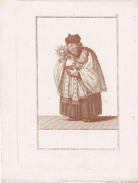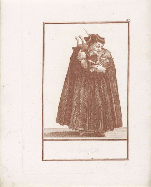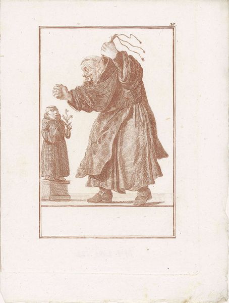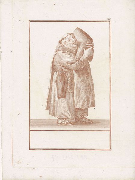 Curator: Here we have "Dikke Monnik," or "Fat Monk," an engraving dating back to 1724, created by Jacob Gole. It is currently held at the Rijksmuseum. The texture and hatching evident in the engraving brings this image to life. Editor: It’s a fascinating piece! The immediate feeling I get is of amusement mixed with slight unease. His grin is a little unsettling. Curator: That is quite a visceral reaction. Tell me, is that unease connected to any symbolic interpretations of this work? The monk figure might seem a little out of place today, but such characters do occupy a significant space in the cultural lexicon. Editor: Absolutely. Think about the historical context – the rise of the merchant class in the 18th century, challenges to religious authority. Depicting a monk, especially one who is, shall we say, generously proportioned, can be seen as satire against the established Church. The engraving also has implications about gender. Barefoot, a suggestion of humility in a patriarchal structure? Curator: Very interesting point, that barefoot is telling! What would you say that our awareness of patriarchal norms offers to our understanding of an engraving, such as "Dikke Monnik"? There could be parallels between the artist’s presentation of the friar as the barefoot man, and a historical association with the barefoot Carmelite or Discalced Carmelites, as their tradition requires them to practice constant penance, sacrifice and brotherly humility, the practice can include a going barefoot! Editor: Well, to situate him in an intersectional analysis we cannot ignore gender or religious order. It shows not only a challenge against religious orders, it mocks them. To depict a monk in such a manner raises question of how male leaders exercise and embody male religious virtue and control? How many are practicing, genuine religious humility? This engraving pushes back on it. Curator: Right, the bare feet definitely carry some symbolism, don't you agree? It prompts a deeper contemplation of religious ideals versus reality. There's a subversive commentary, isn't there, which remains potent even now, inviting us to reflect on figures of power, devotion, and even perceived hypocrisy in religious leaders or in powerful roles today. Editor: Precisely. I find the art historical approach deeply enriches contemporary readings of art. Understanding this can offer us an important challenge for understanding visual communication about social justice issues now. Curator: I completely agree. By unveiling those intricate historical threads, we deepen our own connection to the artwork. Editor: Yes. That intersection allows me to more personally engage and consider.