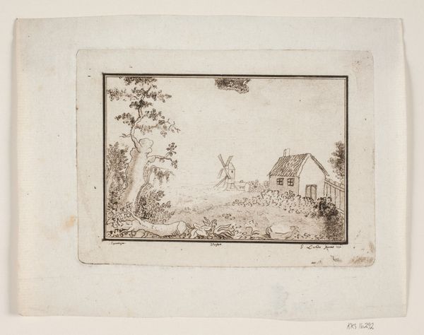 Gerhard Ludvig Lahde created this landscape with house and mill using etching, a printmaking technique, sometime between the late 18th and early 19th centuries. During this era, landscape art served not only as a picturesque scene but also as a reflection of cultural identity and societal values. This seemingly simple image of rural life invites us to consider the romanticized vision of the countryside during a period of significant social and economic change. The placement of the windmill and house within the landscape speaks to human presence and interaction with nature, but it does so through an idealized lens, obscuring the labor and class dynamics inherent in rural life. How does the artist's choice to depict this scene, absent of people, affect our understanding of the relationship between humanity and the environment? The quiet stillness evokes a sense of nostalgia, perhaps reflecting a longing for a simpler time amidst the backdrop of industrialization and urbanization. It reminds us to consider whose stories are told and whose are left out in the construction of national identity.