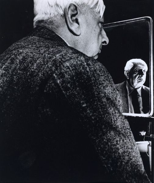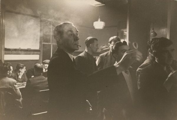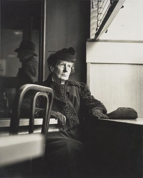 Editor: Here we have Walker Evans’ "Subway Portrait," a gelatin-silver print made between 1938 and 1941. It's incredibly somber, almost melancholic. The figure seems so isolated. What do you see in this piece? Curator: I see layers of social and psychological inscription. Consider the subway itself, a conduit for a transient, anonymous mass. Evans captures this collective experience by focusing on a single individual who carries with them the weight of cultural memory. Note how the man's hat and glasses suggest intellectualism, perhaps a European heritage—a marker of a particular social class and era navigating a rapidly changing America. Editor: So, it’s not just about the individual but the symbols they represent? Curator: Precisely. The man’s averted gaze directs us not to his individuality, but to the collective—to history. The photograph captures not just a moment, but evokes the grand narrative of the American experiment. The poster glimpsed behind his head creates another layer, alluding to other stories unfolding in this public space. Editor: It’s like he's a part of a bigger symbolic landscape. But did Evans intend to create that meaning, or are we projecting onto it? Curator: Intention is only one piece. The power of the image rests in how these elements resonate culturally and emotionally across generations. Even the monochrome palette invites contemplation of history, memory, the passage of time. Evans presents us not just with a portrait, but an artifact of cultural significance, revealing our shared human story within this very modern setting. Editor: That gives me a lot to think about; seeing an individual as part of the larger cultural context really adds depth. Curator: Indeed. And it reminds us that images, seemingly simple, are loaded with cultural and psychological meaning, connecting us to the past and present in profound ways.