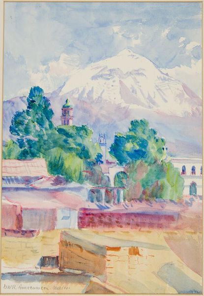 Editor: So, this watercolor is titled "Arequipa, Peru." It was created by Denman Waldo Ross, and it's currently at the Harvard Art Museums. The colors are so delicate; what feeling does this evoke for you? Curator: The subdued palette, dominated by earthy tones, speaks to a long-held respect for the land. The snow-capped mountains in the distance, rendered in soft purples, evoke a sense of permanence, almost a spiritual quality, framing human endeavors against the backdrop of geological time. Do you see how the shadowed figures descending the steps seem to almost blend into the earth itself? Editor: Yes, now that you mention it, the figures do seem to be part of the land. I didn't see it that way initially. Curator: Consider the building, too. Its solid form and earthy hues suggest a blending of human construction with the natural world, a visual reminder of humanity's place within the landscape. Editor: I appreciate how the artist uses color and composition to show humanity's connection to the land. Thanks for this perspective.