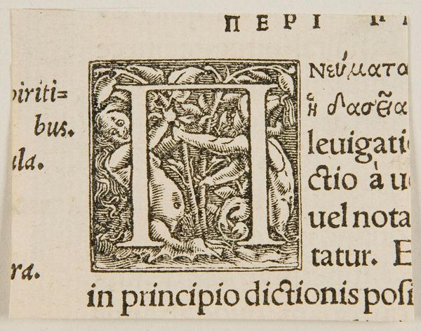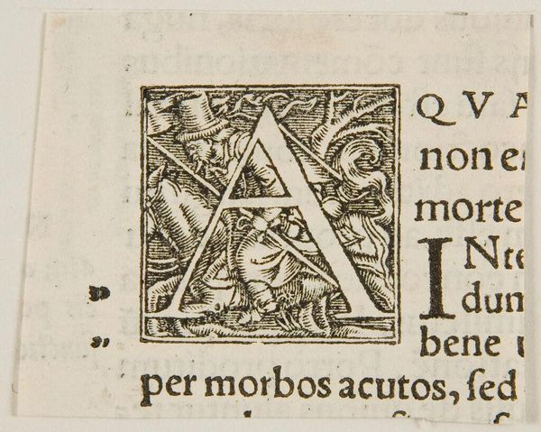 Curator: Immediately striking is the density, how much narrative detail is packed into the Letter A. Editor: This woodcut, simply titled "Letter A" and of unknown origin, speaks volumes about power structures implicit in language itself. Curator: Absolutely. Notice the embedded imagery, the struggle between figures, perhaps a lion and a human form, obscured within the letterform. Editor: The bestial and the human locked in conflict, framing the very foundation of articulation. Is this a commentary on the violence inherent in establishing order? Curator: It’s tempting to see it that way, considering how often alphabets are used to codify law and dictate social norms. Editor: A tiny key, almost, that unlocks an entire discourse on control. It asks us to question the supposed neutrality of language. Curator: Yes, and to consider what stories are being suppressed within the very letters we use. Editor: Makes you rethink your ABCs, doesn’t it?