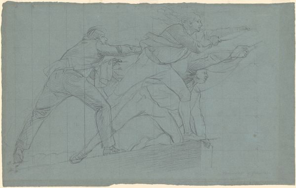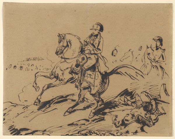 Curator: Today, we're looking at Rudolf Friedrich August Henneberg's drawing, "The Pursuit of Happiness," created circa 1860-1868. It’s currently housed at the Städel Museum. Editor: It feels so ephemeral, almost like a dream rapidly fading from memory. The stark ink against the paper creates an incredible sense of motion. Curator: Yes, it's a vibrant example of Henneberg's initial sketch work. Using ink and possibly light pencil work on paper, it provides a look into his process and artistic experimentation. The very *idea* of pursuing happiness is materialized through pen strokes, becoming almost a commodity, no? Consider what chasing happiness might have meant in the socio-political context of 19th-century Germany. Editor: Absolutely. The sketchy and seemingly incomplete nature of the composition forces you to focus on form, even absence of form. See the implied lines and negative spaces creating dynamic tensions! The subjects almost blend into one another with their rapid gestural lines. I'm drawn to how Henneberg uses the materiality of ink, a medium typically associated with precision, to create an atmosphere of impermanence and the pursuit. Curator: Exactly! It challenges conventional art boundaries. Is this “high art” or mere “craft”? Thinking about his access to these materials—ink, paper—and the labour involved to even produce these very tools, speaks to certain societal privilege inherent to art-making. And that final step to translate pursuit—labor—into visible product on paper, to potentially sell. It raises compelling questions about who gets to create. Editor: True. It goes without saying that we can analyze form independently while still acknowledging context. Take the perspective; the figures' direction suggests an unbridled flight toward some implied goal line in the composition’s construction itself. Curator: Yes. This all ties into the grander economic picture and potential consumption of artwork during Henneberg's time. The piece acts almost as a product of its socio-economic reality; a reflection perhaps on personal desire in times wrought with societal tension. Editor: In the end, the sketch embodies a beautiful tension between fleeting pursuit and the solidity of ink on paper, inviting endless layers of interpretation from form to material. Curator: I agree; viewing art through multiple lenses allows for appreciation that acknowledges context of production without ever losing respect for intrinsic power of Henneberg’s visual mark making.