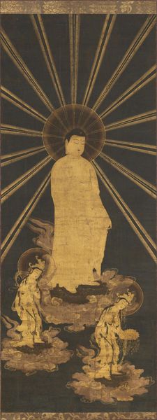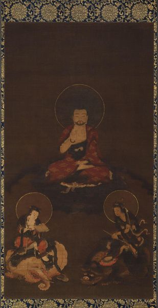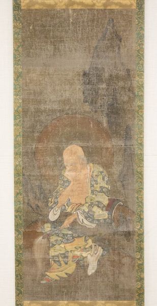 Editor: This watercolor piece, "Portrait of Xuanzang with Attendant," dating back to the early 14th century and attributed to Kasuga Motomitsu, feels remarkably still. The figures are set against a dark background which is pretty striking. What symbolic meaning do you find resonating within this portrait? Curator: Well, observe Xuanzang's serene composure and the accoutrements around him. Doesn’t that small, bright-eyed figure with green skin feel otherworldly? Consider that Xuanzang was a Buddhist monk, known for his arduous seventeen-year pilgrimage to India and his translation of scriptures. This image isn't just a portrait; it's a symbolic representation of devotion, the attendant is probably an ogre. The scripture in Xuanzang's hand and the ritual objects carried by the attendant might allude to this pivotal journey. Can you sense the narrative being conveyed through these symbols? Editor: Yes, the ogre attendant contrasts pretty starkly with the monk, emphasizing his spirituality maybe? Are these iconographic elements consistent with other depictions of Xuanzang? Curator: Often, yes, although stylistic interpretations would have varied across regions and time periods. This rendering, particularly with the otherworldly attendant, likely served to underscore the profound transformative nature of Xuanzang's quest, playing on established iconographic understandings. Editor: This painting and its iconographic density gives me a lot to consider. Thank you for offering insights into the cultural symbols that are interwoven here. Curator: My pleasure, contemplating how visual motifs evolve is always revealing, I also learned something new about the journey it encodes.