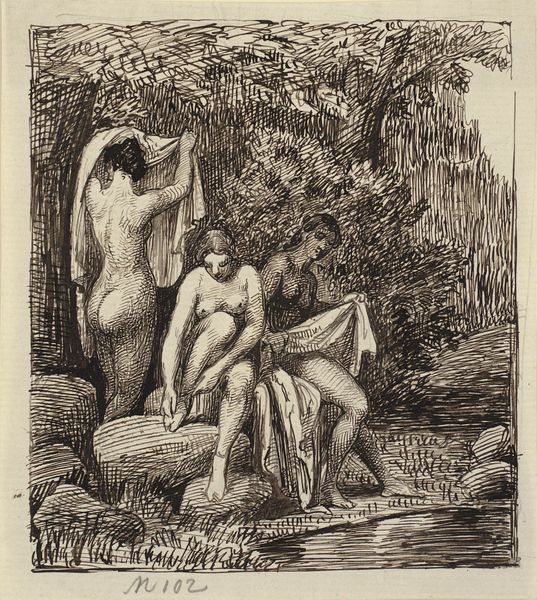 Curator: Anders Zorn’s etching, “My Model and My Boat,” from 1894, captures a striking scene. The composition grabs you instantly. What are your first impressions? Editor: There's a real tension here. It’s as if the moment has been frozen in time – a candid intimacy combined with the crisp, almost stark linework. It is a kind of working class Venus. What was Zorn trying to do with this print medium? Curator: Zorn was known for his adept use of etching. The rapid, almost sketch-like quality allows a level of immediacy. The lines are so economical; note how the reflections on the water are depicted with just a few strokes. What’s fascinating is how this contrasts with the very laborious process of creating an etching. Editor: Labor is right. But how does that labor speak symbolically? Look at the image. We see a sailboat, a powerful symbol of freedom and adventure. Yet it's tethered, idle. Is the model also in some way tied down, perhaps by societal expectations? The netting she drapes herself in feels almost like a cage. Curator: Or it might be more practical. She's clearly been swimming. Perhaps it’s merely a fishing net for catching and preparing dinner? It all points towards lived experience. Also consider how printmaking allowed for the democratic circulation of images and ideas, bringing previously exclusive themes of the female nude into wider circulation. Editor: I do see your point, it brings to mind other popular tropes of the day of art intersecting with ordinary daily practices, maybe even elevating it. Yet, for me, that net, that posture, carries echoes of vulnerability and perhaps a commentary on the female figure as an object of observation in art. And the composition almost frames the model between the sharp angled sail and dark thicket to the right. Curator: Regardless, the dialogue between the industrial, mass-produced nature of the etching itself, and the deeply personal depiction creates an enduring tension in Zorn’s work. Editor: Ultimately, this work is about so much more than technique. It prompts a deeper reflection on freedom, constraint, and the power of visual symbols.