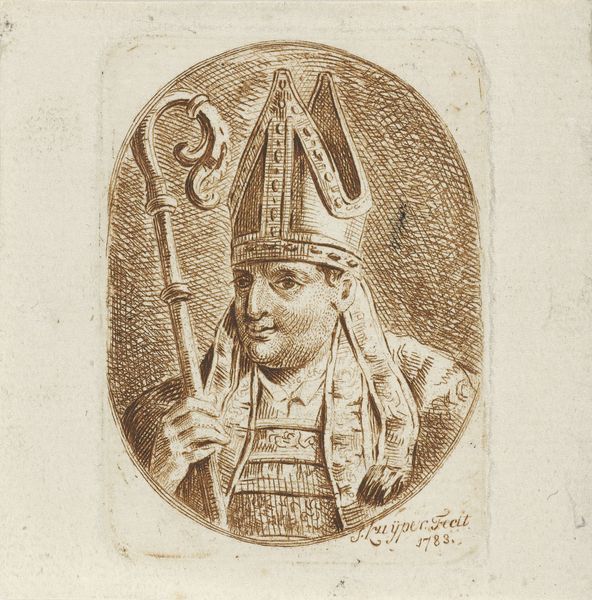 Jacques Kuyper created this oval portrait of a bishop using pen in gray in the late 18th century. The figure’s attire is rich in symbolism. His mitre and crosier are not merely indicators of his ecclesiastical rank; they evoke centuries of religious authority and tradition. Consider the crosier, a staff that has evolved from the shepherd's crook into a potent emblem of spiritual guidance. We see echoes of this in ancient depictions of Hermes, whose caduceus shares a similar form, symbolizing mediation between realms. This bishop’s gaze is both knowing and solemn. It is a countenance that speaks of weighty responsibilities and spiritual insight. The act of portraying a religious figure is itself laden with history, connecting back to the early Christian era when images of leaders were crucial for establishing identity and continuity. These images serve as powerful reminders of how symbols persist, evolving yet retaining their capacity to stir deep emotions and reinforce communal bonds across time.