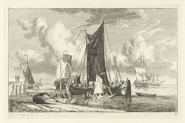Editor: Here we have "In 't Jaar 1688," an ink drawing on paper created anonymously, sometime between 1789 and 1810. There's almost a celebratory feel to this pen sketch, a small boat filled with figures surrounded by grand ships. What can you tell us about its context? Curator: This drawing, though made later, likely depicts or references a specific historical event related to the year 1688, probably connected to naval or political power. These history paintings were particularly interesting because they served to solidify national identities. Editor: So it's not just a pretty picture of ships? Curator: Absolutely not. Think about it – history paintings often aimed to promote specific ideologies or narratives. Whose perspective is represented here? Is it glorifying naval strength, commemorating a diplomatic achievement, or perhaps something else? Consider who might have commissioned or appreciated this drawing at the time it was made. Editor: I hadn't thought about it that way. I was just looking at the pretty ships. The attention to detail, especially on the vessels is quite impressive! Curator: And that technical skill further emphasizes its purpose. The detail lends credibility, making it appear like a true, accurate depiction. Look closer - consider where this piece might have been displayed and who might have seen it. Was it for public consumption or a private collection? Editor: A private collection maybe? Its intimate scale would lend itself well to a smaller space. Learning about the social function of art gives me a whole new appreciation for it. Curator: Indeed. Considering art as a product of its time, shaped by socio-political forces, is essential. Now you see this seemingly simple drawing holds complex layers of meaning related to power, national identity, and artistic purpose.