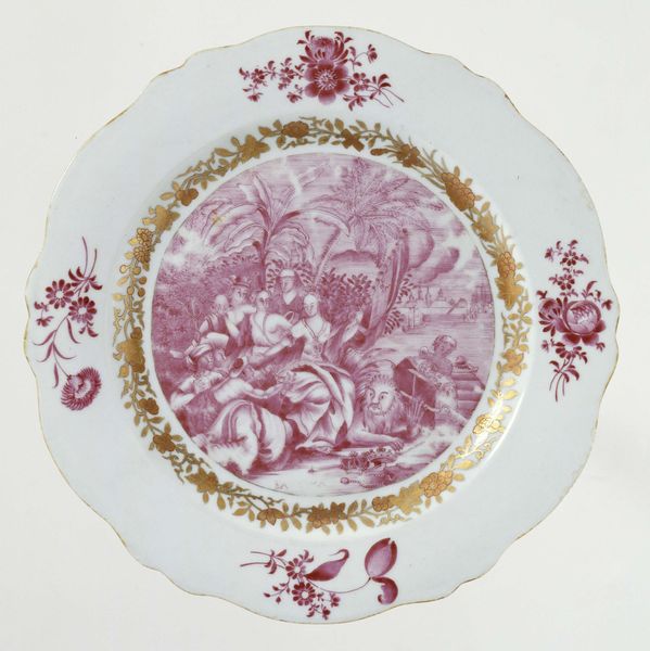 This decorative saucer depicts a courting couple in a landscape, with a flying Hymen, the god of marriage, above them. It was created by an anonymous artist. This object exists within a complex history of love, marriage, and societal expectations. The figures are depicted in what appears to be a pastoral setting, a popular theme which idealized rural life, contrasting it with the perceived artificiality of court life. But this artifice flattens the lived experience of the working class. Marriage, of course, historically had less to do with love and more to do with property and lineage. Who gets to marry whom, when, and how are all crucial questions. The cupid-like figure of Hymen, usually depicted as a winged boy, adds a layer of classical allusion. The image suggests an alignment of earthly love with divine approval. The image invites us to consider the rituals, expectations, and power dynamics embedded in courtship and marriage. It is a reminder of the historical and cultural forces that shape our understanding of love and relationships.