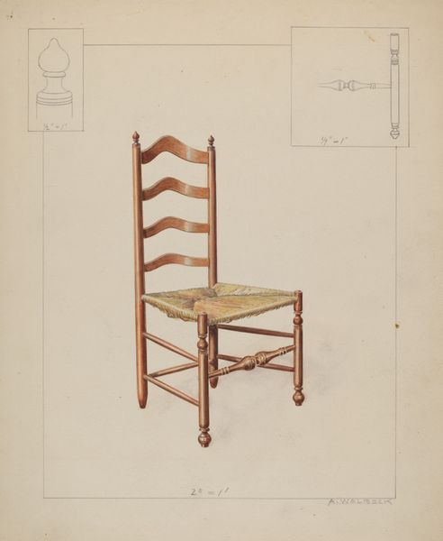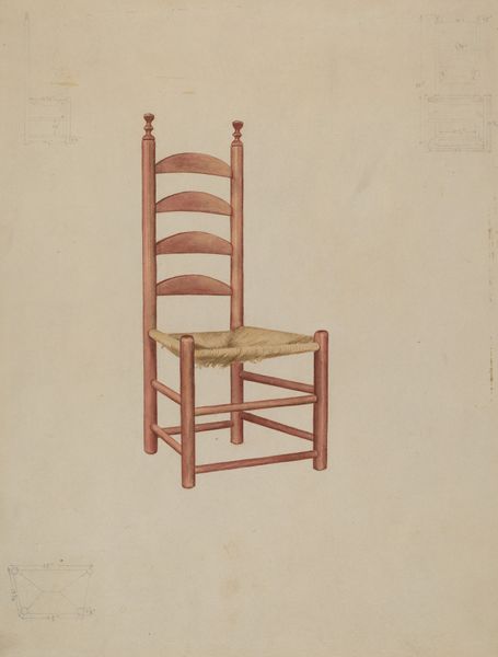 Editor: This is Frank Wenger’s “Armchair,” from around 1937, rendered in pencil and watercolour. It's such a clean, straightforward depiction of, well, a chair! What strikes you about this particular piece? Curator: For me, the beauty here resides in revealing the process. Look at how the pencil underdrawing peeks through the watercolour washes, making the artist’s hand visible. It’s about the means of production as much as the product itself, isn't it? Editor: It does invite you to look closely, doesn’t it? Curator: Precisely! The choice of such a commonplace object – furniture – and the direct, almost diagrammatic rendering challenges our conventional notions of "high art." Think about the labour involved in crafting an object like this chair versus creating its likeness on paper. How does depicting a mass produced object through a traditional craft influence our understanding of both? Editor: So, you're saying it blurs the lines between artistic labour and industrial production? Curator: Exactly. It prompts us to think about materiality itself. The wooden structure, the woven seat – the artist draws attention to these elements, their inherent qualities, and their origin. It speaks volumes about how materials are sourced and utilized during this era. Consider too the context: what was Wenger's role and audience at the time? Editor: It's funny, I came expecting to see an artwork, and now I'm thinking about the social and economic implications of chair-making. Curator: Isn’t it great when a work can shift our perspective like that? Seeing art as a process rooted in material conditions broadens our understanding. Editor: Definitely. I’ll never look at a chair the same way again. Thanks for sharing your insights!