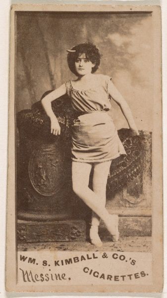 This small photograph, part of a series issued by Wm. S. Kimball & Co., presents the actress Lisa Weber in a pose that echoes classical motifs, though transformed for a modern, commercial context. The way Lisa Weber is seated evokes the classical contrapposto pose, where the figure's weight is shifted to one leg. This stance appears in ancient Greek sculptures, symbolizing balance and potential movement. Yet, in Weber's depiction, the pose takes on a theatrical flair, accentuated by her costume and expression. We observe echoes of Venus binding her sandals, or perhaps a nymph in repose, but here, it is not divine grace we witness. This pose, seen in countless paintings and sculptures across centuries, reappears here, charged with the distinct allure of the modern stage. The gesture invites us to consider how symbols and poses are not static; they evolve, adapt, and reflect the changing values and desires of each era. The image of Lisa Weber, then, becomes a fascinating intersection of cultural memory and contemporary representation.