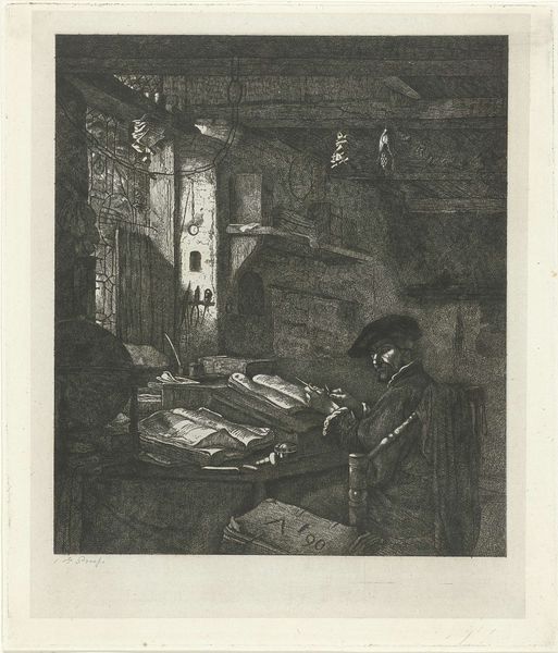 Curator: Standing here before us, we have Pieter Willem van Baarsel's woodcut, "Gezicht op Blaricum," created sometime before 1931. Editor: Immediately, there's this quiet stillness. It feels intimate, almost voyeuristic, like we're glimpsing a private, contemplative moment in someone's day. And it's all in stark black and white. Curator: It’s a wonderful example of the Dutch Golden Age style transposed to a later period, depicting a view of Blaricum. You have this interior space leading out to the Dutch landscape. Editor: Landscape might be a generous word. Those windows offer a view of mostly flat, watery land. Though that tiny village in the background adds character, the artist focuses his rendering inside of a rustic, simple scene: that table set for tea or dinner. And wow, the textures achieved through the woodcut technique, especially in the floorboards! Curator: Exactly. The strategic use of black and white in woodcut allowed van Baarsel to highlight this sense of intimacy. The bold cuts contrast against the blank paper, mimicking light filtering through the room and reflecting in the distance. Editor: And is it just me, or is there a subtle tension here? The sharp angles of the chairs and table meeting those open horizontals. Inside-outside; dark-light. It’s not dramatic, but keeps you noticing it. Curator: Certainly. And I think, the genius of van Baarsel. By choosing this interior perspective, he allows us to ponder on themes of place, memory, and domestic life, creating something deeply moving from the mundane. Editor: The kind of scene you might dream of—one offering sanctuary. All in black and white—it's all pretty wonderful, honestly. Curator: Well, "Gezicht op Blaricum" certainly makes you appreciate the beauty in what is easily overlooked, and reminds us of home. Editor: Yeah, in our modern world it makes you think: “This view could easily turn into our own”. Simple beauty... it invites us to create our own masterpiece right where we stand.