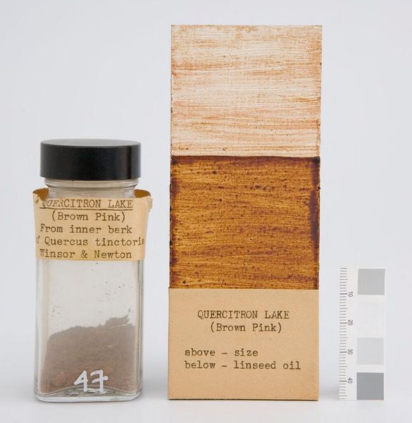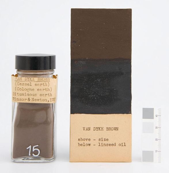 Curator: This is "Yellow Ochre (French) with alumina, silica and inerts," manufactured by Lefranc. The artwork presents the pigment in its raw state and as applied with linseed oil. Editor: I find its simplicity striking. The raw pigment in the jar beside the color swatch evokes a sense of earthiness and unrefined beauty. Curator: Absolutely. The Lefranc company highlights the commodification of artistic expression. How does access to this specific pigment shape artistic output, both historically and now? Editor: The labels, the jar, and the card all point to the means of production and distribution. This pigment empowers artistic agency but also reflects the standardization inherent in mass production. Curator: Thinking about art materials in terms of power structures opens up conversations about who has access to create and whose voices are heard, or obscured. Editor: Precisely, and this work makes those processes visible. It makes me appreciate the labor and resources, and also the cultural implications that underpin the creation of art.
