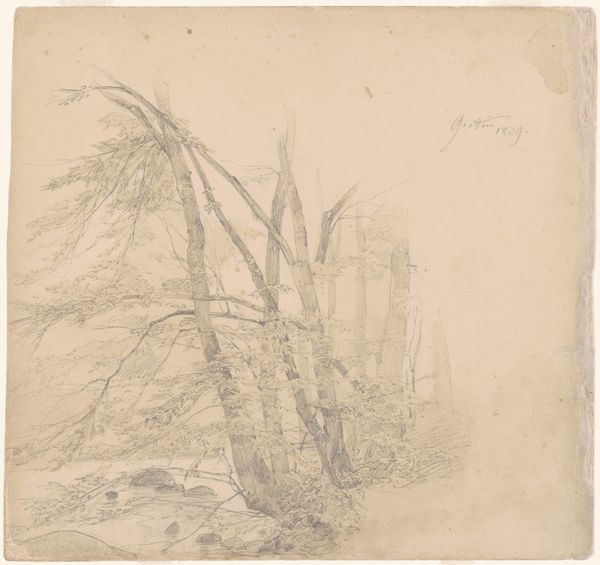 This graphite on paper work, *Brush; and Hudson Brush Fence,* by Andrew Fisher Bunner presents two distinct studies of natural forms. The composition is divided horizontally, inviting a comparative reading of the two scenes. In the upper section, the angular lines of the brush fence create a dense, almost architectural structure, while the lower study offers a softer, more diffuse arrangement of foliage. Bunner's use of line varies, from sharp, defined strokes to softer, more blurred marks. The drawing's emphasis on texture and form over detail anticipates the dissolution of solid form prevalent in Impressionism. The interplay between the structural solidity of the fence and the organic flow of the foliage challenges our perception of nature as either ordered or chaotic. Bunner’s piece operates within a semiotic system, where the 'brush' and 'fence' act as signs, prompting reflections on nature and artifice. The fence, a man-made structure, imposes order on the wildness of nature.