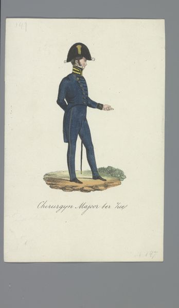 Albertus Verhoesen made this print of an adjutant-schrijver ter zee, or warrant officer, likely in the first half of the 19th century, using etching and hand-coloring. It is an intimate portrait of labor from a distance. The technique would have begun with a metal plate, likely copper, which was coated with wax and then scratched with a needle to create the design. The plate would then be submerged in acid, which bit into the exposed lines, creating grooves. Ink was then applied to the plate, and wiped away from the surface, leaving ink only in the etched lines. Finally, paper was pressed against the plate, transferring the image. The final touch was the hand-coloring, which added vibrancy and depth to the print, accentuating the dark blue of the warrant officer's jacket, and his red collar and cuffs. Such prints were commercial products, made to circulate widely and familiarize viewers with the uniforms of the day. This etching is more than just a picture; it's a window into the world of 19th-century labor, and its industrialization.