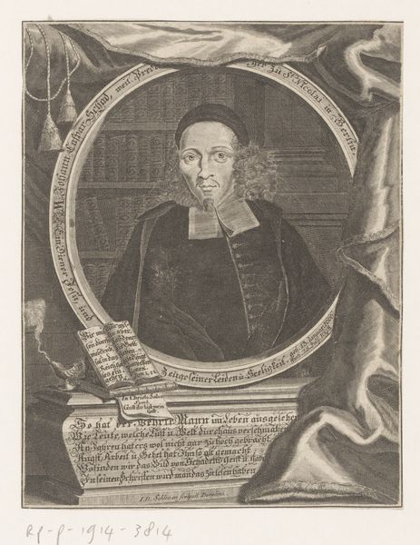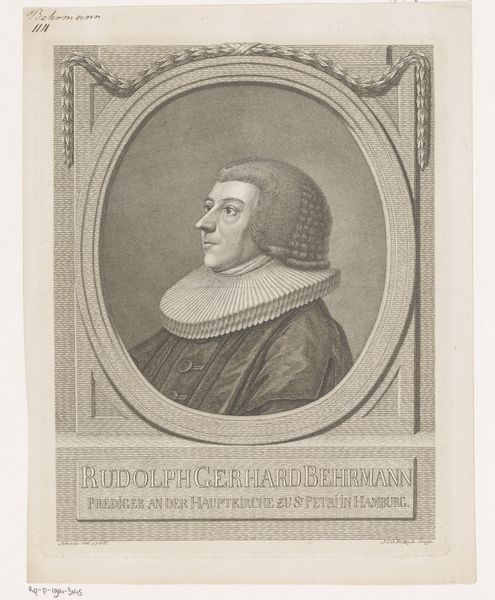 This is Hermann Mosting’s rendering of "Portret van Gottfried Weiss," made using engraving techniques. The portrait is encased within an octagon, a shape that introduces an intriguing tension through its angular geometry. The subject, Gottfried Weiss, is captured with meticulous detail. Weiss is depicted with soft lines and tonal variation that suggests the texture of his hair and the intricate ruffles of his collar. The octagonal frame disrupts the conventional circular or rectangular portrait format, suggesting a break from traditional modes of representation. The inscription and decorative foliage that surround the portrait contribute to the artwork's complex semiotic system. They serve not only to identify the subject but also to contextualize him within a framework of knowledge and accomplishment. The strategic use of geometric form, combined with detailed engraving, challenges our expectations and invites deeper contemplation about representation and meaning.