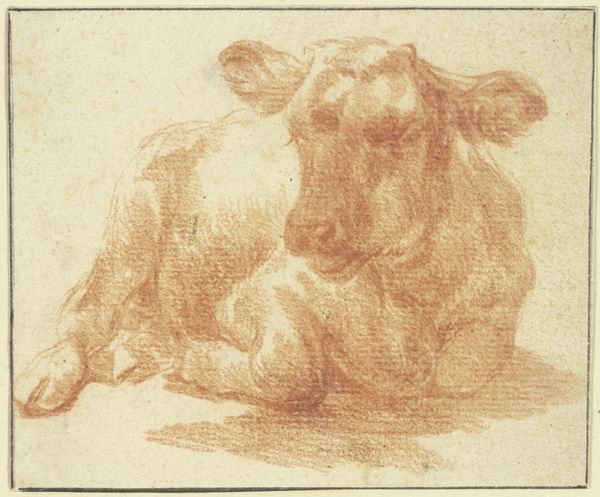 Adriaen van de Velde made this drawing, "Lying cattle to the left," in the 17th century. Van de Velde lived during the Dutch Golden Age, a period marked by unprecedented economic prosperity, global trade, and a flourishing of the arts. This drawing reflects the era's complex relationship with nature and agrarian life. During this time, the Dutch countryside was not just a backdrop but a symbol of national identity and prosperity. Van de Velde's choice to depict cattle, animals central to the Dutch economy and diet, speaks to the intersection of culture and commerce during this period. While his work seems simply to depict the realities of Dutch life, it also participates in the narrative of Dutch cultural superiority. There is an emotional resonance in this image, a kind of tranquil observation, that encourages a dialogue between the viewer and the pastoral subject.