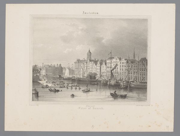 Editor: We're looking at "Gezicht op de Casino Sociëteit te Amsterdam," made sometime between 1830 and 1840 by Théodore Fourmois. It’s an engraving, so a print, of a cityscape. It feels very precise and ordered, yet also quite still, almost frozen in time. How do you interpret this work, focusing on its form? Curator: The formal elements speak volumes here. Note the artist's careful attention to line and texture, achieved through the meticulous engraving process. The composition is structured to guide the eye – from the foreground boats and figures, along the canal, to the solid architectural forms in the background, culminating in the distant skyline. How would you describe the interplay of light and shadow? Editor: It creates a sense of depth, definitely. The building on the left is lighter, drawing my eye, while the far bank is shaded. Curator: Precisely. The tonal variations are masterful, constructing depth and atmosphere. Observe also how the artist employs geometric forms – the rectangular buildings, the cylindrical masts of the ships – juxtaposed with the more organic shapes of the trees and figures. What does that contrast suggest to you? Editor: It creates a balance, I think. The rigid forms of the buildings are softened by the natural elements and human activity. It makes the scene feel both solid and alive. I was initially thrown off by the print making it hard to find dynamism. Now, seeing the subtle variations, the way the artist handles form, line and texture is impressive! Curator: Indeed. We've seen that the true subject is not merely the Casino building but Fourmois’ skill with structure to produce something ordered and balanced, but full of variety.