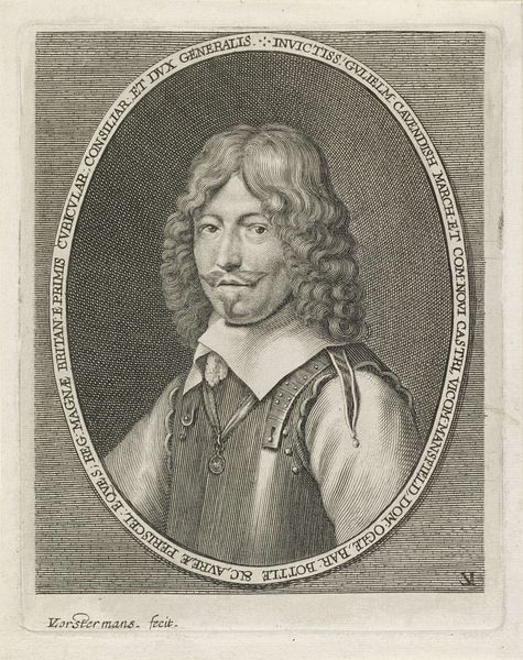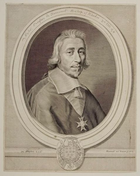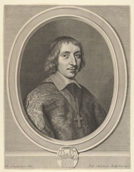 Curator: Robert Nanteuil's portrait of Philibert-Emmanuel de Beaumanoir presents us with an intriguing figure. Editor: The man appears contained, almost as if he is aware of being framed, both literally and figuratively. There's a palpable sense of control and self-presentation here. Curator: Considering Nanteuil was the official portraitist to the court of Louis XIV, that feeling is perhaps unavoidable. This engraving, now housed at the Harvard Art Museums, offers insight into the power dynamics of the era. Editor: Absolutely. The subject's attire, the ornate medal—these aren't merely decorative. They communicate wealth, status, and belonging to a specific social order. Curator: It’s a window into the construction of identity during a time of great social and political change, and how images helped reinforce existing power structures. Editor: A reminder that representation itself is never neutral, and that even in portraiture, we see reflections of broader societal narratives. Curator: Indeed, a conversation starter about the politics of image-making. Editor: A valuable perspective.