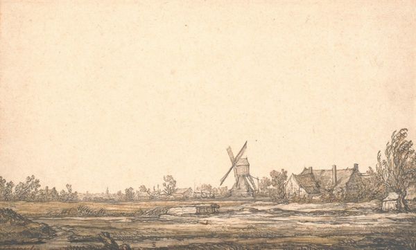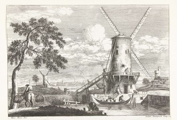 Curator: This is Giuliano Giampiccoli's "Landschap met molen aan water," or "Landscape with mill on water," created around 1739-1740. It’s currently held here at the Rijksmuseum. Editor: It strikes me as so meticulously rendered, almost obsessively so. The textures – stone, water, vegetation – are painstakingly captured. It speaks of a sustained engagement with the subject, a real labor of looking and representing. Curator: Absolutely. The choice of engraving as a medium is quite deliberate, considering the detailed rendering we see. What’s fascinating here is the juxtaposition of industry, in the form of the windmill, against this sort of idyllic pastoral scene. The windmill is not merely functional; it becomes a symbol of progress. Editor: Precisely. You see this preoccupation reflected in the artist's work process too, transforming landscape into cultural artifact via laborious acts: physically incising marks upon the plate. It is no accident. The means dictate the symbolic weight. Curator: The windmill as a cultural symbol evolved significantly in Dutch art. Initially just part of the landscape, they became powerful emblems of Dutch ingenuity and prosperity. In Giampiccoli’s composition, we witness this symbolic weight accumulate even more layers when combined with details of daily commerce. Editor: Consider all human labor, the people actively working in relation to the landscape, whether in that small boat by the stairs or the figure on horseback down to the water level on the right. Labor is interwoven, shaping, moving through the entire piece—even down to the engraved textures. It is about showing process, use, materiality of human and environment relationship. Curator: Yes, everything seems deeply connected through these industrious and communicative exchanges. The windmill then anchors us not just to place, but to time, representing a specific period of economic and cultural flourishing. Editor: The work speaks subtly, reflecting production within the artist's moment while highlighting human manipulation over materials that surround. So, it reflects an important process within its imagery as a finished piece. Curator: So much is encoded through simple means, even now as a modern viewer! I'll certainly pause here longer on future visits to appreciate the image making in full effect! Editor: Absolutely! These sorts of image making carry remarkable implications when carefully unpacked.