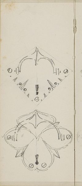 Curator: We’re looking at “Ruitvormige ornamenten,” or "Rhomboid Ornaments," a sketch by Gerrit Willem Dijsselhof, created between 1876 and 1924, now residing in the Rijksmuseum. It’s a pen and pencil drawing on paper. My immediate reaction is to the symmetry – almost meditative in its balance. Editor: Meditative? My eye is drawn to the diamond shapes, repeating, each with these...exclamation point figures within. There's a quirky dissonance despite the geometry. I also notice the looseness of line, the sketchiness which hints at the design process more than a finished artwork. Curator: Indeed, Dijsselhof was a key figure in the Dutch Art Nouveau movement. Ornament, pattern, and the symbolic properties of form were central. These rhomboids are like ideograms, stripped down emblems of an elusive concept. Think of it as a study, where the artist is playing with abstracting elements of nature or traditional motifs into a contemporary language. Editor: Precisely. And notice how within that geometry, he is playing with contrasting textures - solid shapes, little curves, small dots arranged to direct the eye. Almost a semiotic puzzle, the circles act like little indexes drawing our gaze around. Curator: What strikes me is the way Dijsselhof anticipates a design that lives beyond its pure visual form. It whispers of function, potential application within furniture or interior architecture. It almost begs to be repeated across textiles or integrated into graphic design. These seemingly simple shapes, imbued with Dijsselhof's sensibility, evoke tradition and speak to the possibilities of industrial design. Editor: A visual bridge, in a way, a design in potentia; that's very well put. It's remarkable to see how just a few pencil lines suggest an entire system. Looking closely allows us a glimpse into the artist’s design methodology, allowing us to witness the conceptual distillation that makes Dijsselhof’s Art Nouveau unique. Curator: Absolutely. It invites speculation, contemplation even—which is perhaps the truest value of a good ornament: its potential to engage the mind and invite dialogue across culture. Editor: A perfect synthesis of form and meaning then— the essence of design itself captured in the briefest sketch.