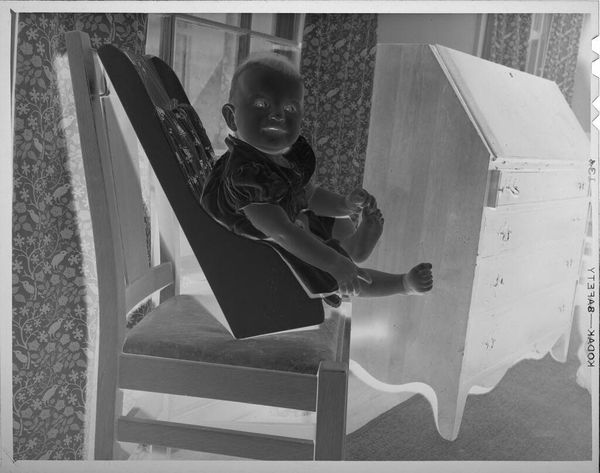 Editor: This gelatin silver print shows a little girl sitting on a trampoline. It's by Lucian and Mary Brown, and something about the reversed tones makes it feel unsettling. What do you see in this piece? Curator: It's interesting how the reversal highlights the girl's isolation within a space meant for joy. I think it brings to light questions of childhood innocence versus the potential for societal pressures, or even gendered expectations. The trampoline, usually a symbol of carefree fun, becomes a contained space, almost like a stage. Does the background setting remind you of anything? Editor: It looks like a party, maybe? Curator: Exactly. It reminds us of the performative aspects of childhood, the expectations placed on young girls, and the subtle ways they're often put on display. This photograph speaks volumes about the complexities of growing up female. Editor: I didn't think of it that way. The photo feels less innocent now. Curator: Art invites us to question, reconsider, and see the world through different lenses.