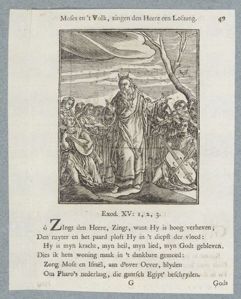 Curator: Christoffel van Sichem the Younger created this piece, "Prophecy of Zachariah," sometime between 1645 and 1740. It’s currently housed in the Rijksmuseum. Van Sichem employed engraving, creating a detailed print that belongs to the Northern Renaissance style. Editor: It hits me as strangely comforting. Even though it’s starkly black and white, and clearly depicting a stern lecture, there's a peacefulness in the gathering. The line work, while simple, gives it this naive, folk-art charm. Curator: Absolutely, that linear style and figuration tie it into wider narratives around religious art during the period. These engravings allowed for broader dissemination of biblical stories, influencing popular understandings of faith and morality. Zachariah is depicted admonishing the people of Israel to turn away from their sins. We should consider how it reinforces notions of sin, obedience, and divine authority. Editor: I am drawn to the central figure. Is that a mother holding a baby? Even amid this exhortation, this emphasis on repentance, you see tenderness. A human moment that gives a different reading. It becomes less about the fire and brimstone and more about, perhaps, reformation. Personal growth and change. Curator: Precisely! It is fascinating to unpack how gender and familial roles are visualized. Women, often positioned as embodiments of morality, are depicted as keepers of innocence, cradling the future. And this emphasis ties neatly to patriarchal structures within religious doctrine. Editor: It's also kind of funny—there’s a pair of discarded shoes in the front! I love these little touches of the everyday intruding upon the grand, spiritual pronouncements. It humanizes the whole thing. Maybe this means we really can show up as we are, shoes kicked off, imperfections and all, ready to listen and hopefully, learn. Curator: Yes, exactly! We must remember how the quotidian is inserted in the narrative—giving a new dimension to it. What it means to "hear" the prophet in the humdrum reality. Van Sichem’s work speaks volumes not only about religious history, but its entanglement with the stuff of everyday existence. Editor: I think looking at this simple scene offers a hopeful reminder. Maybe we can seek change and better versions of ourselves within community and even within ordinary circumstances. It's less daunting that way, wouldn't you agree?