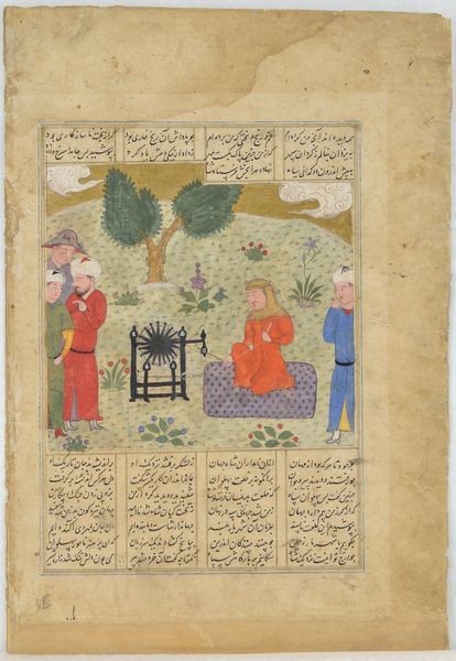 This folio from a Khavarannama, or Book of the East, attributed to Maulana Muhammad Ibn Husam ad Din around the 15th century, presents three men before a castle using ink, opaque watercolor, and gold on paper. The materiality here is fascinating. The artist has worked on paper, a relatively common support, but elevated it through the application of precious materials such as gold leaf. The vivid colors achieved with opaque watercolors speak to a highly skilled and meticulous application process. The narrative scene with the characters, the verdant landscape, and the architectural details of the castle require considerable labor to realize. The relationship between the materials, labor, and social context is clear. The artist would have needed access to specific pigments and the gold, indicating patronage from wealthy sources. The very act of creating such a detailed illustration underscores the value placed on craftsmanship within the society. It is a testament to the rich artistic traditions flourishing at the time.