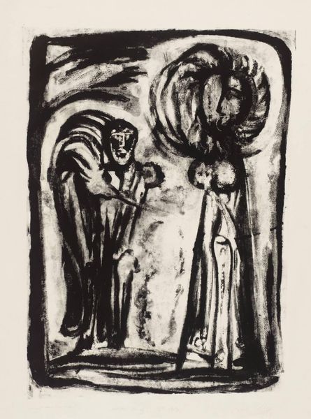 Curator: Claire Mahl Moore created this arresting image, "The Authorities," in 1936. It's a powerful woodcut print. What’s your first reaction to it? Editor: The composition immediately strikes me. The figures seem both compressed and monumental. There’s a real tension between those powerful authority figures looming above, and the vulnerability of those below. It evokes a sense of unease and social commentary. Curator: Yes, that compression you notice amplifies the symbolism, doesn’t it? Notice the three figures at the top – the 'authorities' she depicts – their faces are largely obscured by hats and dark shadows, lending them an almost mask-like quality, while the lower figures are expressive in suffering. Editor: The contrast is deliberate and jarring. It makes you think about power structures, anonymity versus exposure. Those in authority seem detached, almost caricatured with the cigars, reinforcing the Social Realism that is attributed to Moore’s style. I would suggest it's not just about political power, but gender and race also, given the disproportionate effects such authority had on minority communities. Curator: The artist skillfully employs the medium of woodcut itself to emphasize the dramatic contrasts – the stark black and white representing a clear divide, not just of class or power, but perhaps even morality. Do you pick up on religious undertones? Is that a rosary or a set of prayer beads hanging from what appears to be a coffin or platform separating the powerful from those below? Editor: Absolutely. Religion used to manipulate and divide is hardly a new trope, but so effective here with the positioning, as you mentioned, between these classes. It also serves to highlight the false piety used to justify oppression and abuse. The faces of the 'authorities' are obscured, dehumanized by their position, rendering them symbols of oppressive forces rather than individuals. It becomes about systemic injustice rather than any singular culprit. Curator: And the upturned faces in the lower portion evoke a sense of desperate hope or pleading. It's fascinating how a black-and-white image can speak volumes about complex social realities of that era – a period of intense social change and awareness of socioeconomic disparities. Editor: I find the emotional rawness really cutting. It urges us to reflect on those same inequalities continuing today, particularly those embedded within systems of control. The artist doesn’t offer a solution, but a mirror to society itself. Curator: Indeed. A powerful piece reflecting not just the past but, unfortunately, our present. Editor: Art at its best, reminding us to stay alert, and question power dynamics.