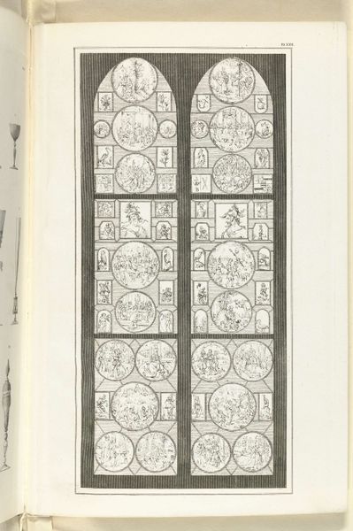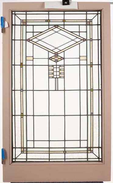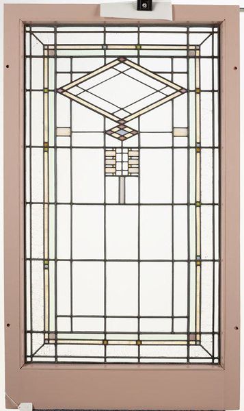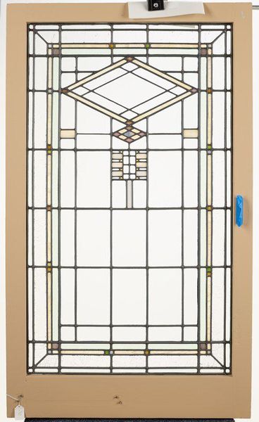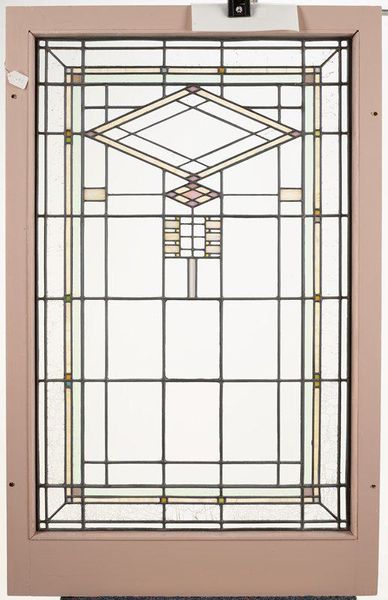 Editor: So this is "Window" from around 1913 by William Gray Purcell, currently residing at the Minneapolis Institute of Art. It's glass work and what I first see is an incredible geometric symmetry. It almost feels like a deconstructed building. What strikes you about this piece? Curator: The inherent architectural quality certainly commands attention. But beyond mere representation, note how Purcell masterfully manipulates line and shape. The diamond motif, for example, isn’t merely decorative. Consider how its angularity is echoed and re-scaled throughout the entire composition, creating a formal visual echo that promotes a sense of harmony. Editor: So it's less about the window's function, and more about how those shapes interact with each other? Curator: Precisely. Consider the colour palette. The subtle use of pastel hues against a predominantly clear glass field. How does this restraint enhance or diminish the overall formal impact? Are those individual glass segments creating patterns or ruptures? Editor: I see what you mean. The very muted colours make the clear glass the dominant color, adding to its airy, almost ethereal quality, a stark contrast with the strong geometric structure that seeks attention in itself. The segments become articulations of void within that structure. Curator: Indeed. And note how that central vertical axis grounds the more volatile, angular forms. Purcell has created a sophisticated interplay between structure and light. This interplay shapes our reading of this design. Editor: So by focusing on line, shape, and color, you almost remove the context of "window" and arrive at its very structural essence? Curator: Exactly! We strip away the extraneous and examine the bones, the inherent framework. This distillation reveals the artist’s primary concerns. How about you? Did this formalism reveal any insight to you? Editor: Absolutely. I’ll never see a window the same way! Looking beyond its practical use and examining its formal elements really changes the perspective and makes it far more thought-provoking.