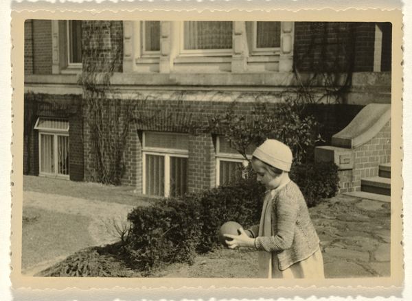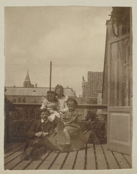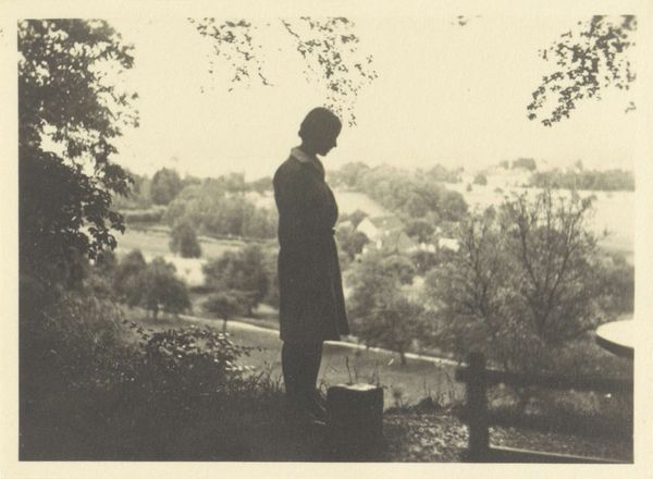 Curator: Here we have a photograph by Delizy, "Vrouw kijkt vanaf balkon uit over (vermoedelijk) Châtel-Guyon", taken in 1904. Editor: It has such a dreamy, almost melancholic quality. The hazy sepia tones contribute, but it's mostly in the composition. The figure on the balcony feels both present and distant. Curator: That visual distance mirrors the socio-economic distance of the subject. The elevated view, the fashionable dress, these are signifiers of bourgeois life at the turn of the century. It evokes the restricted role of women within that class. Editor: I agree about the implied distance and social separation, but my eye is more drawn to the tonal range and balance. Light and shadow play against the woman, from her wide hat, down to the balustrade. The linear perspective leads you beyond her and into the city below. Curator: It's interesting that you emphasize the urban landscape. Delizy chose to capture the therapeutic benefits of a small thermal-bath town, in this particular region of France that was rising in prominence among those with the resources for restorative retreats. We should question whether Delizy meant to also reveal something about leisure class structure in that specific context. Editor: Structure yes, class structure aside, I can also analyze its balance: the almost square format, for example. The placement of the figure is off-center to create an intentional asymmetry with the environment of the background. And yet, somehow it maintains a surprising equilibrium. The photographer captured a singular moment within these coordinates of lines and edges. Curator: And those structural features you point to don’t exist in a vacuum! We must also reflect on how the visual aspects both reflect and perpetuate social norms and expectations. This particular aesthetic emerged as a clear form of artistic expression, linked to broader political shifts, which had direct implications on personal identity, domestic life, leisure and travel. Editor: Precisely. Delizy created a microcosm of this moment. Looking at the framing again, my reading moves from seeing her in that balcony box, toward imagining the broader cultural constructs outside of its edges. Thank you for your socio-historical lens. Curator: The same can be said back to you; formalism is a beneficial angle into unlocking that historical context.