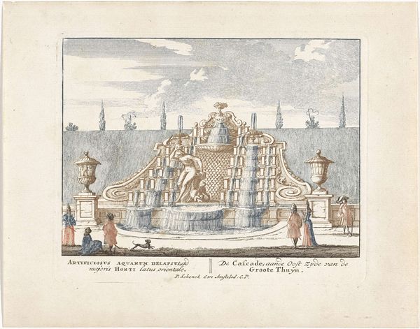 Curator: Here we have Domenico Parasacchi's 1637 engraving, "Rustieke fontein in de Belvedere tuinen te Vaticaanstad," depicting a rather fantastical fountain. What's your initial impression? Editor: Well, first off, it looks like something straight out of a dream. There's an odd juxtaposition of grandeur and playfulness, wouldn't you agree? That tiny ship sailing beneath such a massive, ornate structure really catches the eye. Curator: Precisely! These gardens were a place for popes to display both their power and their refined tastes. This print documents one of many constructed spectacles made to awe and impress visitors and cement their power and control of society and art. Editor: The symbolism here is rich. Fountains have always been potent emblems. Water, of course, signifying life, purification, and constant flow. But the aged paper adds another layer to it, creating the effect of nostalgia for the spectacle. What is no more… Curator: Indeed, consider how baroque art uses iconography. This particular fountain, festooned with naturalistic elements and capped with that bold eagle motif, projects dominance. The eagle would certainly invoke Imperial Rome. The landscape framing itself is deliberate. Editor: And there's a beautiful tension between the idealized, almost mythological fountain and the realistic rendering of that small ship, so minutely and yet deftly captured. It could even be seen as humanity bravely venturing forth under the watchful eye of established authority. Curator: Very astute. In looking at the ship's size we might ask ourselves who these images of the Vatican gardens were created for, for whom would that tiny ship mean something, how and where did they consume these representations of power and landscape? The art market was growing during this time and these images played an important role in making the city knowable. Editor: This has given me much to ponder. It’s more than just an old print; it’s a portal into the artistic and socio-political mindset of the time. Curator: It shows us how imagery and political intention intertwine, showcasing how art served a key function in shaping society and perception of power, wouldn't you say?