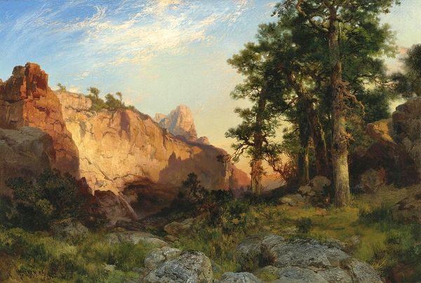 Editor: Here we have Carl Spitzweg’s "Gebirgslandschaft", an oil painting that immediately draws me in with its sublime portrayal of nature. It feels so peaceful and somewhat remote. What strikes you when you look at this work? Curator: Well, given the socio-political context of the early-to-mid 19th century in Europe, I immediately look at this painting as a carefully constructed idea of "nature." Note how the lone figure, almost an afterthought, is placed within a landscape seemingly untouched. Does it read as truth, or a construct? Editor: That's a great question. I guess it feels like both? It’s idyllic, but also idealized. Almost too perfect, if that makes sense. How would this painting function publicly at the time? Curator: Precisely. Consider the rise of industrialization; urban sprawl began eroding familiar landscapes. Paintings like this reinforced an imagined past, a simpler time where man existed harmoniously with nature. It's less about accurately depicting a place, and more about creating a nostalgic image for a rapidly changing society. It becomes a visual commodity in a sense, reinforcing societal desires. Editor: So, Spitzweg isn’t just painting a landscape; he's tapping into a yearning for a world that may have never truly existed. Curator: Exactly. It's a powerful commentary on the impact of progress and the selective way we remember the past, one brushstroke at a time. And remember that this representation largely benefited the emerging bourgeois class! Editor: This gives me so much to think about. I initially saw beauty, but now I see so much more. Thank you! Curator: My pleasure! Looking closely helps us read the politics ingrained into seemingly simple aesthetics.