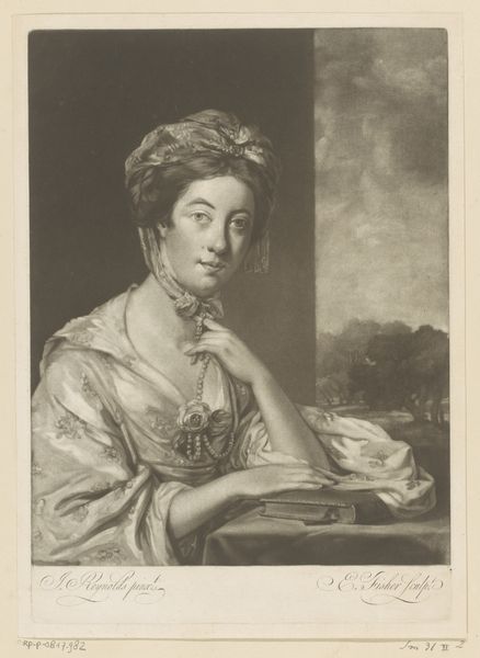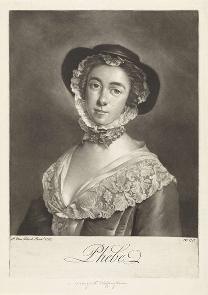 Curator: Let's turn our attention to "Portret van Lucy Ebberton", an engraving from circa 1745 to 1765, residing here at the Rijksmuseum and attributed to James McArdell. What strikes you first about it? Editor: A gentle wistfulness, I think. The softness of the light, the way she’s holding what looks like a small posy. There's an idealized pastoral feeling, almost like she is a shepherdess in disguise. Curator: Yes, definitely. Engravings like this were highly fashionable at the time, and served as a powerful means of circulating portraits and propagating social and political narratives. To own a print of a prominent member of society was almost a status symbol itself. Editor: I find the pearl necklace she’s wearing fascinating, that combined with the hat, trimmed with flowers... it adds to that symbolism, doesn’t it? Pearls, historically, have stood for purity and even tears. Flowers, of course, suggest both beauty and fragility. The combination hints at a certain… vulnerability despite her high social standing? Curator: Intriguing reading! You see, McArdell didn't directly create this portrait. The original would've likely been an oil painting. As an engraver, he disseminated the imagery further, democratizing access, though still largely to the upper echelons of society, naturally. Editor: And do you think the act of turning it into an engraving, simplifying it to grayscale, influences how we see Lucy today? Perhaps robbing her of some vivacity? Curator: Perhaps, though the very act of transforming the image gave it a new life. The crispness of the lines, the shading McArdell achieves, it has its own unique aesthetic appeal. Think of it less as a perfect replica and more as a new interpretation within the visual culture. It certainly would have helped fix Lucy in the public consciousness of the day. Editor: I can certainly agree with that! And while her direct story might fade, the image persists, loaded with ever shifting cultural weight, continuing to speak across the ages. Curator: Indeed. And by examining how these images circulate, we glimpse at the social structures and values embedded in everyday life centuries ago.
