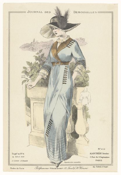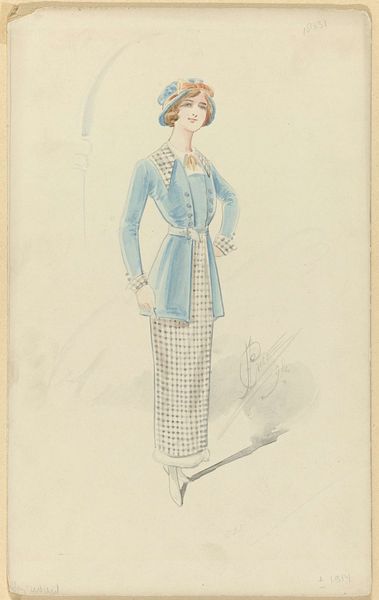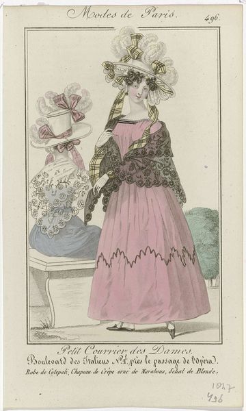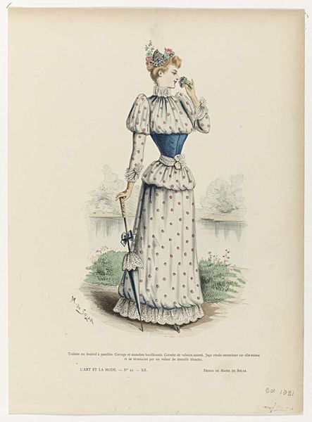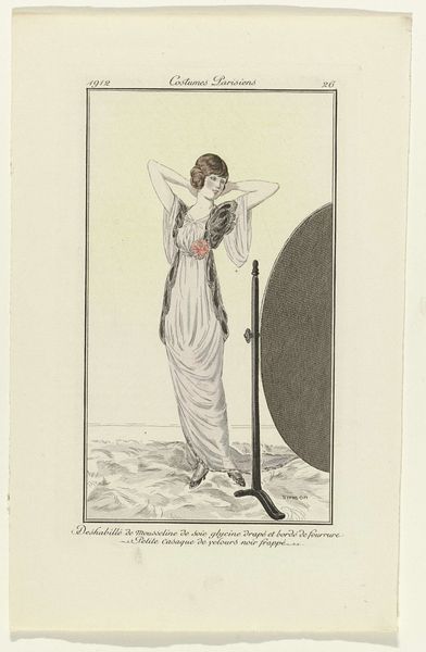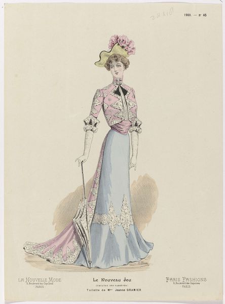 Editor: Here we have "La Mode Illustrée, Novembre 1899, No. 45," a drawing by Cholet from 1899. I'm really struck by how the artist captured this ideal figure using lines to create forms that suggest volume. What stands out to you when you look at this image? Curator: The first thing that arrests my attention is the structure of the dress. The way Cholet employs these bands around the torso creates a fascinating division of space. Notice how these horizontal elements interact with the verticality of the figure to dictate a clear rhythm. Do you see it? Editor: Yes, I see how the eye is directed up and down the body because of those structural bands, like a deliberate system. What about the subtle colour choices? Curator: Precisely. The colour palette—that muted, delicate pink—serves less as a descriptor and more as an exercise in tone and balance. Note how it's offset by the austere, almost ghostly presence of the bust on the left, a study in contrast between surface adornment and classical form. Also, the linear precision, visible in the folds of the dress, seems to serve to reinforce the intended geometric impression. Editor: It’s interesting how much information is being conveyed simply through line and colour. The whole composition has become so much richer than just a drawing of a pretty dress. Curator: Exactly. By examining the interplay between line, colour and structure, we understand this work's enduring aesthetic and significance. It transcends simple depiction; it is an exploration of form itself. Editor: This was a really enriching dive into deconstructing form, which I'll definitely take forward in my understanding of other artworks. Curator: Indeed, it's a method to unlock hidden levels within artistic creation, hopefully expanding one’s own artistic endeavours.