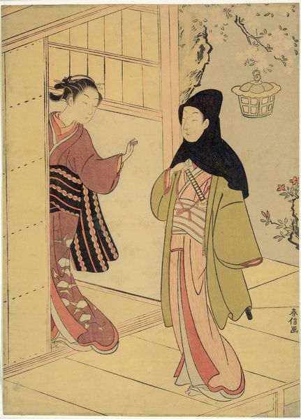 Suzuki Harunobu crafted this woodblock print, Courtier and Lady, around 1765, using a technique called nishiki-e, or "brocade pictures." This method involves multiple blocks, each inked with a different color, meticulously aligned to create a vibrant, layered image. Look closely, and you’ll notice how the texture of the wood grain subtly influences the appearance, particularly in the delicate rendering of the figures' robes and the architectural details. The soft, muted tones—achieved through careful layering of translucent inks—imbue the scene with a sense of tranquility and refinement. The production of these prints involved a complex division of labor, with skilled artisans responsible for carving the blocks, applying the inks, and pressing the paper. The process speaks to a sophisticated system of production and consumption, reflecting the growing urban culture of Edo-period Japan. Ultimately, understanding the materials and making of this artwork is critical. It not only highlights the technical skill involved, but also reveals much about the social and economic context in which it was created.