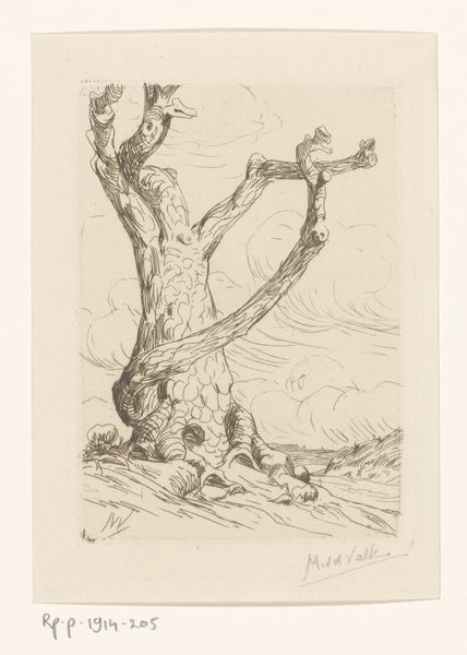 Gretha Pieck made this black ink woodcut called 'Linde in Lage Vuursche'. The bold lines, they remind me of Paula Modersohn-Becker! I love the way she coaxes so much life and movement out of these lines. There's a real drama to it, don't you think? It's a dance between the black ink and the bare paper. The artist isn't afraid to let some areas just be empty, and that makes the tree stand out even more. Look at the upper part of the tree - it's like an explosion of tiny lines, a real contrast to the blank sky. And down at the bottom, the roots are like grasping claws! I wonder, what was Pieck feeling when she made this? Was she thinking about the tree’s age, its strength, or maybe something else entirely? It feels like a conversation, and the more I look, the more I hear it.