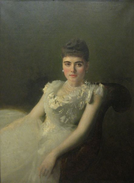 Editor: This is Wilhelm von Kaulbach's portrait of "Prinzessin Marie Gabrielle Von Bayern," painted in 1890 with oil paint. It's such a striking image. Her red dress really pops against that dark background, almost like she's stepping out of the shadows and demanding to be seen. How would you interpret this piece? Curator: It's a fascinating example of late 19th-century portraiture, firmly situated within the context of both Romanticism and emerging Realism. Notice the almost theatrical presentation of the princess – her vibrant gown, the pearls, the fur stole. How do you think this contributes to the message of the artwork? Editor: It definitely projects an image of status and power, almost a staged formality. But it also feels… restricted, perhaps reflecting societal constraints placed upon women of that era, even royalty? Curator: Precisely! The painting isn’t just a depiction of Marie Gabrielle, but a carefully constructed image meant to reinforce specific societal norms and expectations. This academic approach to art served particular political and social functions. Considering the public role of royal portraits at the time, what impression do you think the Bavarian monarchy aimed to convey? Editor: Probably one of stability, wealth and beauty. Although to modern eyes, there is an undercurrent of melancholia, perhaps because we now recognize this level of representation as artifice. It is not a spontaneous rendering of its subject, and it makes me reflect on how history treats women as symbols. Curator: Exactly! It’s a testament to how art serves as a window into social and cultural dynamics. Reflecting on this, has your perspective shifted on the relationship between portraiture and power? Editor: Absolutely. It is more than just art. It becomes an artifact about a period, society, and politics. Curator: Indeed! It invites questions about power, gender and the evolving nature of representation itself.