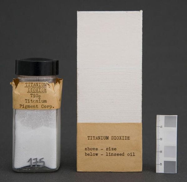 Editor: So, this is “Lithopone,” artist unknown, but manufactured by New Jersey Zinc Co. It seems to be a pigment sample. I’m struck by the emphasis on the materials themselves, almost like a readymade. What do you see in this piece, considering its industrial origins? Curator: The lithopone pigment here isn't just about aesthetics; it embodies industrial processes and material composition. It’s a product of labor and resource extraction, questioning the role of the artist's hand versus industrial production. How does understanding its production context change your perception of its value? Editor: I guess I hadn’t thought about art in terms of mass production and labor before. It certainly adds a layer to its interpretation. Curator: Exactly! By considering its materiality, we move beyond traditional notions of artistic genius to consider the broader social and economic forces shaping art.