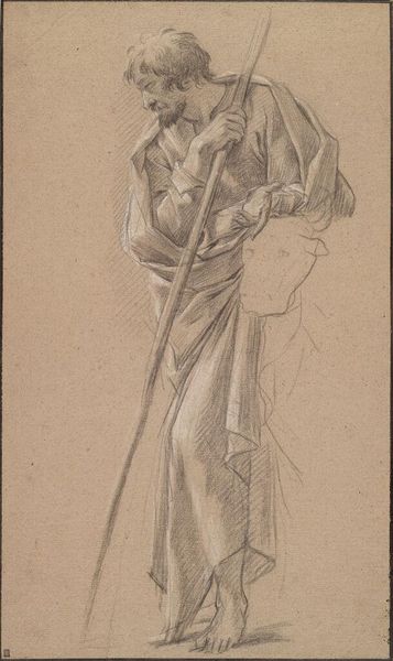 Editor: This is Boris Grigoryev's sketch, "Standing Woman," at the Harvard Art Museums. There's a quiet melancholy about her; she seems both present and distant. What stands out to you? Curator: The fur accents speak of luxury, but her posture… guarded. Notice how the lines of her robe both conceal and reveal, suggesting a duality. Perhaps she represents a societal shift, a yearning for something lost or unattainable. What memories does she evoke in you? Editor: That idea of societal shift is interesting. I keep thinking about the gaze. Curator: Indeed, her eyes hold a certain weight. It's almost as if she's looking back at us, questioning our own values and expectations. Editor: I hadn't thought of it that way. Seeing her as a symbol of societal questioning gives the sketch so much more depth. Curator: Images often hold layered meanings if we are attuned to what is buried beneath.