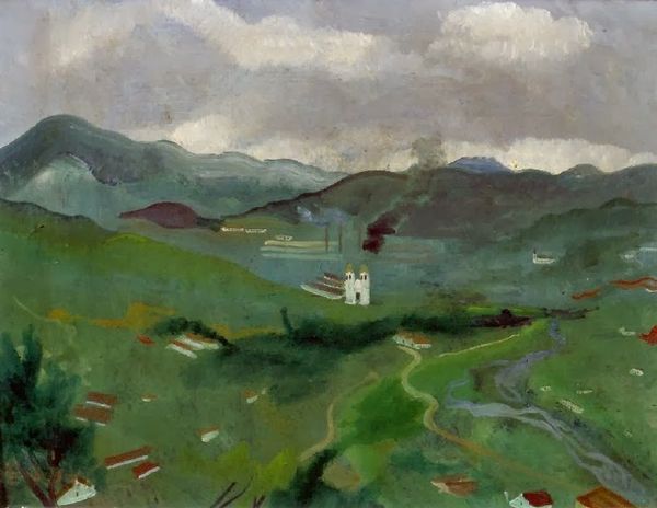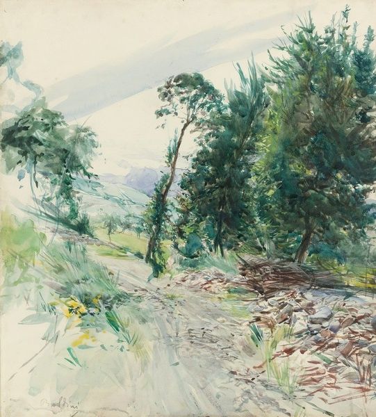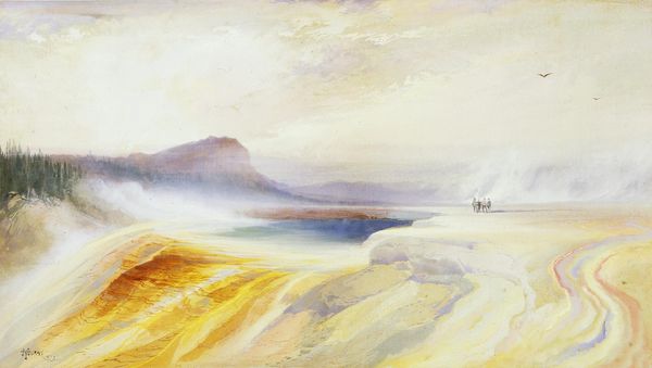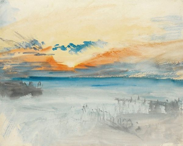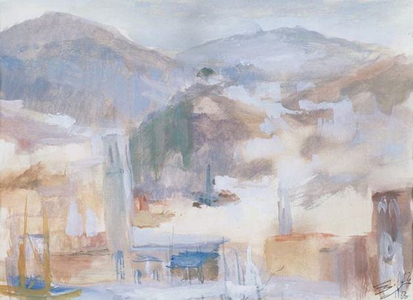 Editor: This is Roland Vivian Pitchforth's watercolor, "Loch Awe." It's so soft and ethereal. What strikes me most is its quietness; what do you see in it? Curator: I see a reflection of post-war Britain. Pitchforth painted this landscape with a subtle sense of melancholy. The loch, a place of supposed serenity, is overlaid with a quiet acknowledgement of loss and transition. How might this relate to the aftermath of conflict? Editor: So, the serene landscape is also a commentary on a nation recovering? Curator: Precisely. The muted colors might represent a society grappling with grief, while the open space could symbolize the potential for healing and renewal. Editor: That gives a totally different depth to the painting, seeing it as more than just a pretty landscape. Curator: Indeed. Art often holds a mirror to society, reflecting both its beauty and its struggles.