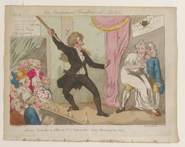 Editor: So, here we have James Gillray's etching, "The York-Minuet," from 1791. The exaggerated figures immediately caught my eye. They’re almost comical! It seems to be critiquing someone. What's your take on this dance, what do you see happening beyond the surface? Curator: Ah, Gillray! A master of the savage visual roast. To me, this isn't just a dance; it’s a deliciously wicked commentary on the Duke and Duchess of York. I see the minuet itself, traditionally a symbol of grace and aristocratic elegance, being thoroughly satirized. Do you notice how the Duchess's enormous skirt almost overwhelms her and the Duke seems rather...unathletic? Editor: Definitely! Their proportions are so exaggerated. Was Gillray making a specific political point, or just poking fun at the royals' appearance? Curator: Probably both! Gillray’s work often served as visual ammunition in the political battles of the day. I imagine audiences would have relished this image, laughing at the perceived foibles of the upper crust. Though there is so much cultural context that we lack today... Does the image's enduring appeal lie in its humor, perhaps? Editor: Yes, definitely. The over-the-top depiction is timelessly funny. Plus, it makes you wonder what the real-life figures would have thought of this rather unflattering portrait! Curator: It also leaves me thinking about who decides what’s considered "good taste" and who gets to poke fun at it, I love the mischievous and subversive nature of works like this, it inspires me! Editor: It's fascinating how art can hold up a mirror, even a distorted one, to society. It really brings the period to life. Thanks for shining light on this! Curator: The pleasure was all mine, it is these reflective conversations that keep art evolving!