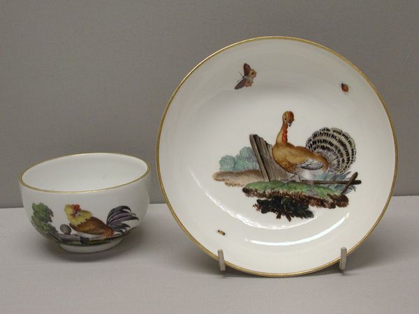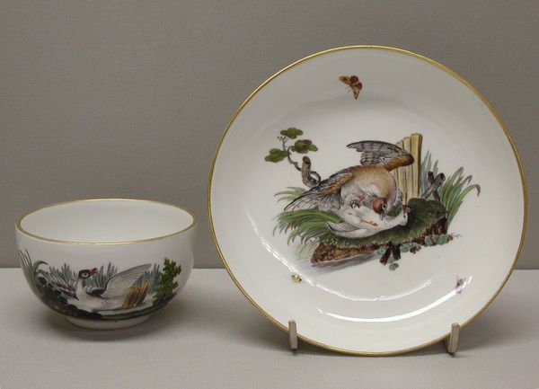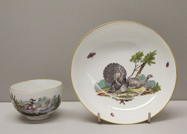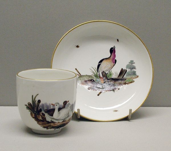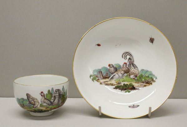 Editor: Here we have a "Teacup and Saucer" made between 1770 and 1780 by the Höchst Manufactory, currently residing in the Metropolitan Museum of Art. It’s made of porcelain and the painted scenes look quite charming. What strikes you when you look at this? Curator: Well, I'm immediately drawn to the materials and the manufacturing process itself. Porcelain was, and still is, a commodity often trading hands. In terms of production, Höchst was one of the earlier German factories attempting to capture the luxury porcelain market previously dominated by China and later Meissen. What labor practices went into this? Editor: So, it's less about the pretty birds and more about the… business of making it? Curator: Exactly! Consider the raw materials: kaolin clay, crucial for porcelain, was quite a commodity. Access determined who could even produce similar artworks and the location in Germany facilitated import and export. Think about the labor – from mining the clay to the skilled artisans painting those details. Who were they, and what were their working conditions? This isn't just decorative art; it's a product of complex social and economic forces. Even those 'charming' scenes, what's the consumption practice being celebrated? Editor: I never really thought about a teacup this way. How the manufacturing impacts design and subjects that artists select. Now it's harder to see this as just decorative, knowing all of this. Curator: Right? This isn't just a pretty object for consuming tea. It embodies the resources, labour, and economic systems of its time. Porcelain itself, initially prized for its durability and scarcity, had changed with the rising number of suppliers who could emulate Chinese methods. Editor: So the images here and gold trim could be displays of status? Curator: Precisely, they would be showing the commissioners’ power and economic class through their material possession, it serves as visual code. And you realize class hierarchies through an appreciation for their art and design elements. Editor: That's so interesting. Thanks for opening my eyes to it all! I’ll definitely be thinking differently about material culture now.