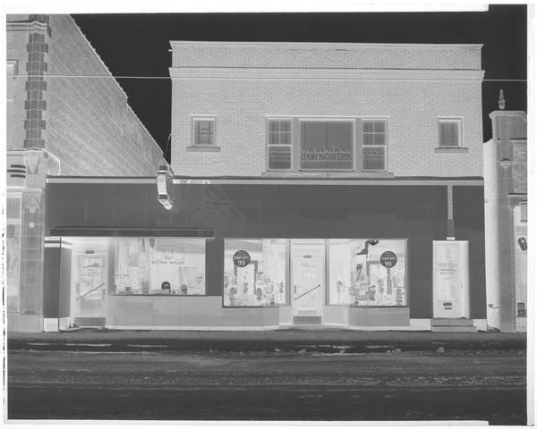 Editor: This photo by Harry Annas, *Untitled (Centennial flags outside Ford dealership)*, captures an interesting scene! I’m struck by the contrast between the bright dealership facade and the dark sky. What formal elements stand out to you in this image? Curator: The inverted tonality immediately grabs attention, doesn't it? The stark contrast redefines depth. Note the linear progression of the building itself, juxtaposed against the organic form of the foliage. Editor: It does create a unique visual experience. Thanks! Curator: Indeed. Consider how the play of light and shadow shapes our reading of the scene. It's a meditation on form itself.