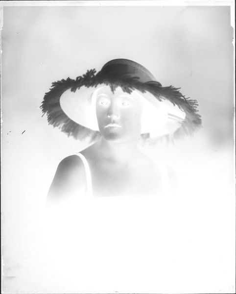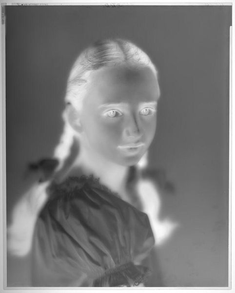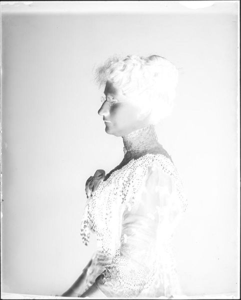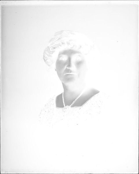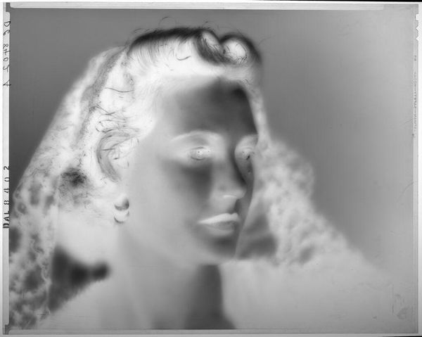 Curator: This arresting portrait, currently held at the Harvard Art Museums, is attributed to C. Bennette Moore and is believed to depict Phyllis Moore Stoll. Editor: It has a ghostly, almost ethereal quality, doesn't it? Like peering into a memory, the stark contrast giving it a dreamlike feel. Curator: Indeed. The photographic negative format lends a certain visual drama. Historically, portraiture served to immortalize its subjects, to broadcast status, and here, the interplay of light and shadow adds a layer of introspection. Editor: I wonder, too, about the hat and lacy shawl. They speak to a particular era, don't they? One where clothing was an integral part of crafting an image, a persona. The way the light dances on the lace almost feels like a secret language. Curator: Precisely. It invites a conversation between the visible and invisible, a hallmark of photographic portraiture from this period. What we see, and what remains hidden. Editor: In the end, it feels like more than just a likeness; it's an echo of a life.