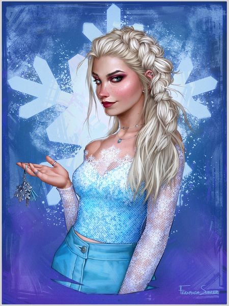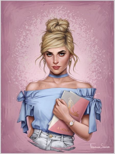 Curator: This is Fernanda Suarez's "Tinkerbell." What's grabbing you right away? Editor: Immediately, that sassy side-eye. It’s like, "Yeah, I'm Tinkerbell, and what?" There's a real sense of playful defiance, but there's also… I don’t know, a millennial realness to her. Curator: It's a fascinating reconstruction of a familiar figure, isn't it? Suarez situates a classic Disney character within a very contemporary framework of portraiture, one that is rooted in a hyper-mediated vision of celebrity and fashion. Notice the way her tattoo, and indeed her entire ensemble, subverts the innocence traditionally associated with the character of Tinkerbell. Editor: Exactly! The little star tattoo. The modern haircut! And she’s not just in a leafy dress—it’s an olive-green two-piece with trendy ties. Plus, the fairy wing backpack! Someone has an ironic sense of humor. She looks like she’s about to head to Coachella. Curator: Yes! This costuming choice situates her as a fashion-forward influencer. We're seeing Tinkerbell renegotiated for the internet age, her mischievous nature reimagined as knowing, almost performative, defiance. The large, blue backdrop, reminiscent of a fantasy-scape, becomes flattened and cartoonish, underscoring that we are looking at an avatar, not an actual person. Editor: It also makes me think about how we often reimagine our childhood icons as we grow older. It's almost like Suarez is exploring what Tinkerbell would be like if she, too, had to navigate the messy reality of being a grown-up in the 21st century. I wonder what other characters she's updated in this way... Curator: This reimagining allows the viewer to project their own interpretations of autonomy, self-expression, and identity onto the fairy figure, thus opening dialogues about what these terms mean within their own lived experiences. The magic is not gone, but is indeed transformed. Editor: This hasn't just rekindled my childhood; it’s added a completely new, fascinating chapter to it! It’s amazing to see something so nostalgic feel so totally now. Curator: It offers a compelling commentary on the nature of modern fairy tales.